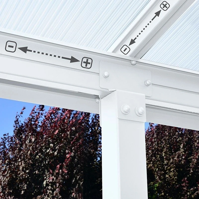 This polycarbonate patio cover also features a heavy-duty, powder-coated aluminium frame, powder-coated aluminium profiles and laser-cut galvanised steel connectors, all of which are robust, durable and impervious to rust.