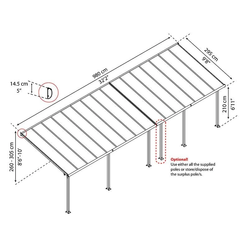 Thanks to the adjustable wall mounting plate and flexible pole positioning, you can set the patio cover’s height, distance from your house and pole spacing to your own requirements.