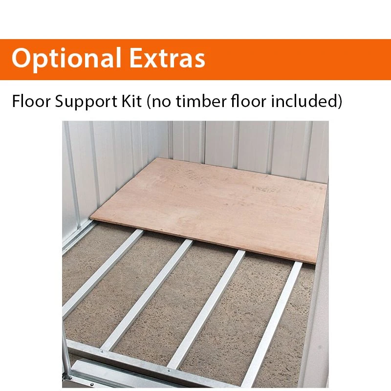 **Please note that this metal shed comes without a floor (unless floor support kit selected) and should be erected on a level concrete or paved base. The optional floor support kit does not include a timber floor. If purchasing the floor support kit it cannot be returned alone should you decide not to build a floor.**