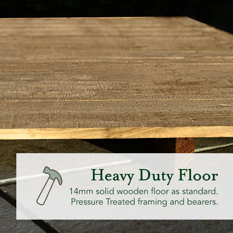 - 14mm solid wood floor – 40% thicker than standard shed flooring