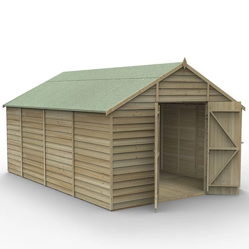 Available in a range of designs and sizes, Forest 4Lifeâ„¢ Overlap Pressure Treated Sheds are beautifully handcrafted here, in Great Britain. Packed full of premium features, they are the best range of overlap sheds Forest has ever made. This particular model is the 15×10 Windowless Double Door Apex Shed (4.48m x 3.2m), making it perfectly suited to people requiring secure garden storage for large amounts of tools and equipment.