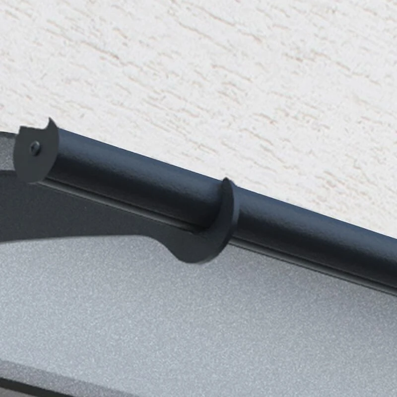 The powder-coated aluminium profiles and laser-cut, powder-coated galvanised steel support arms are equally stylish and impervious to rust. A hidden rubber gasket, fitted to the rear of the frame, seals the porch canopy to the wall and eliminates any risk of seepage.