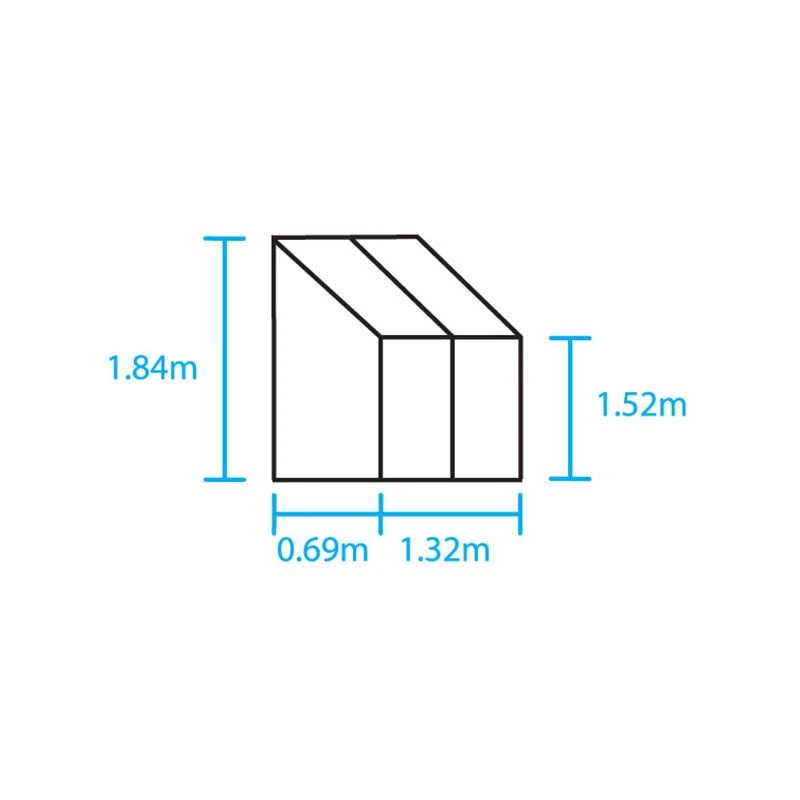 Robust, durable and rust-resistant, the aluminium frame is guaranteed for 12 years. All our Wall Gardens from Halls have a front height of 1.53m, a ridge height of 1.82m and a depth of 0.69m. This 4×2 greenhouse is 1.32m wide and provides you with a base area of 0.91m2.