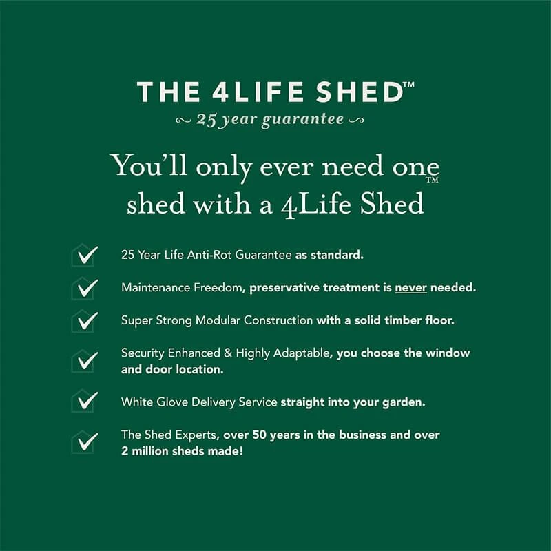 This garden shed is expertly designed and built by Britain’s leading manufacturer of wooden sheds. Pressure treated and supplied with an extraordinary 25-year anti-rot guarantee, which is the longest guarantee on the market, the wood will never need retreating, sparing you the inconvenience of costly, time-consuming maintenance and providing you with an unbeatably durable shed. You’ll only ever need one shed with a 4Lifeâ„¢ Shed!