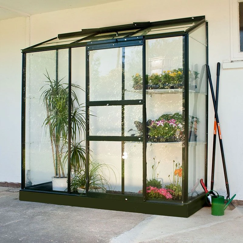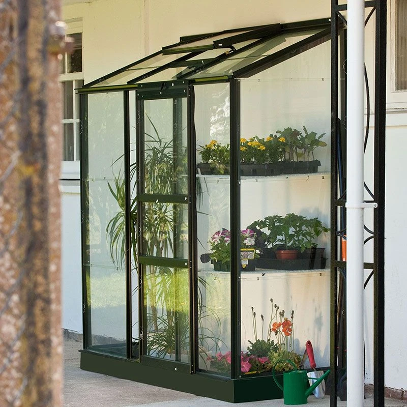 A small greenhouse perfect for small gardens or beginner gardeners, the Wall Garden 24 with green frame from Halls Greenhouses is a charming lean-to greenhouse.