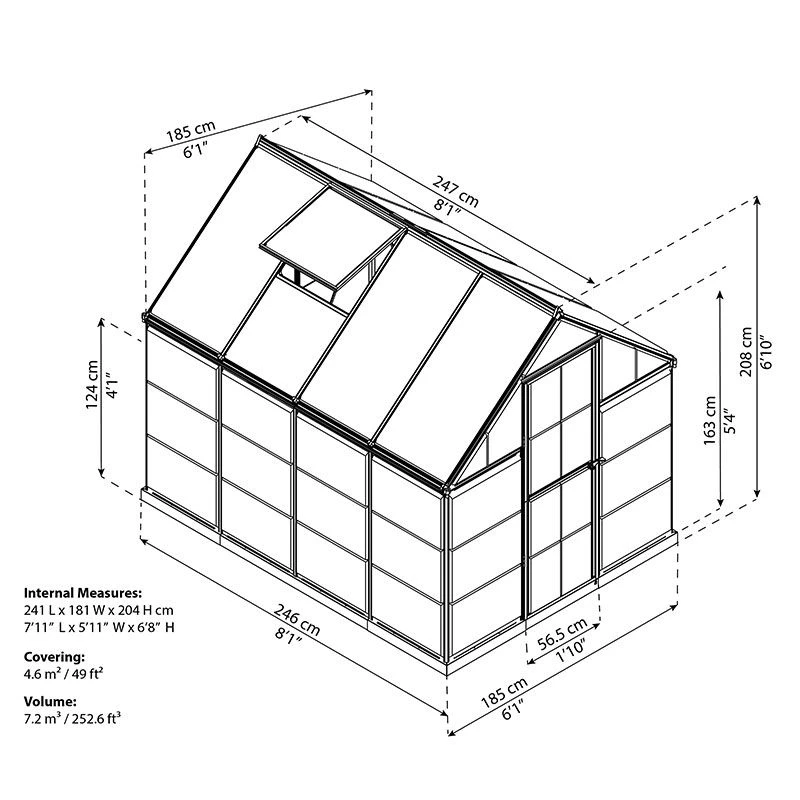 Utilising the very latest Fine Shield Technologyâ„¢, this 6×8 greenhouse is expertly constructed from 4mm twin-wall polycarbonate roof panels and 0.7mm crystal-clear polycarbonate side panels, supported by a rust-resistant aluminium frame and galvanised steel perimeter base.