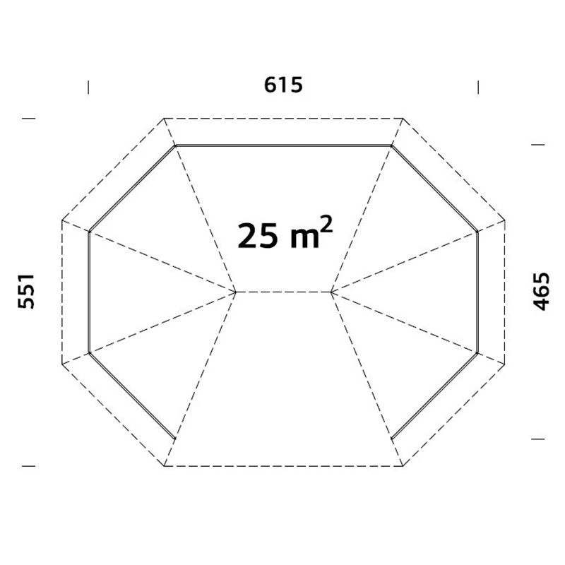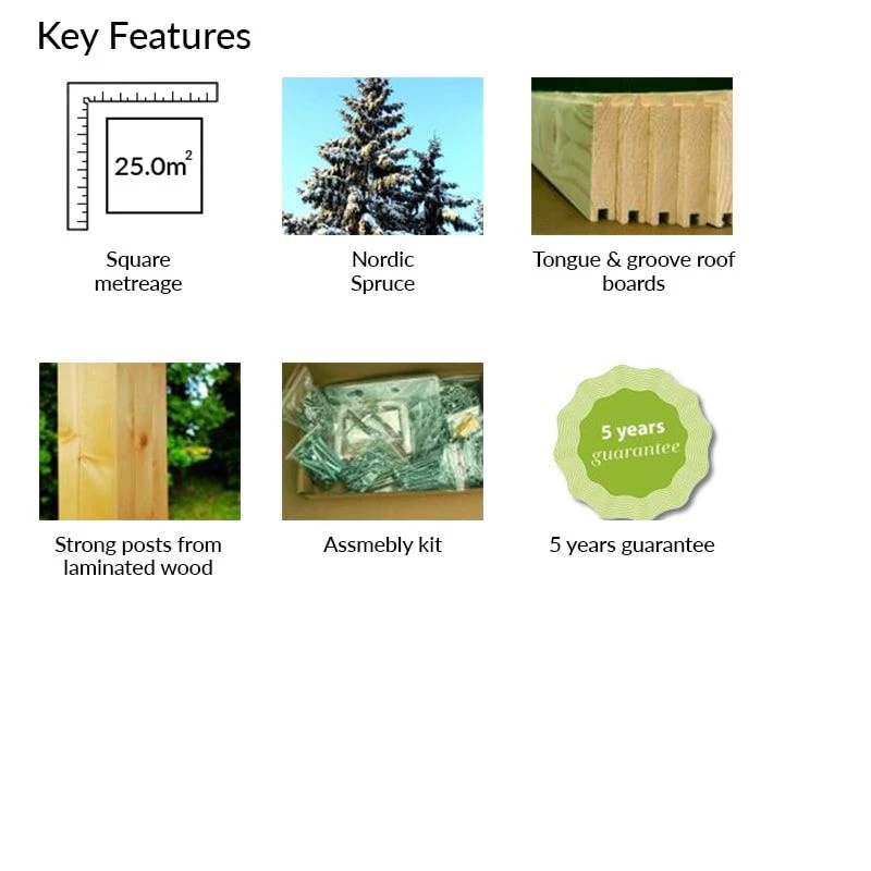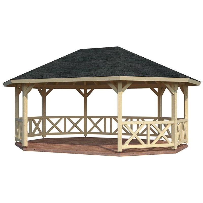 Lovingly built from premium Nordic spruce, the robust 120mm2 frame and laminated, interlocking wooden posts make for an exceptionally robust and durable construction, which will prove immune to warping or cracking. The 19mm tongue and groove roof will keep you and your guests dry, whilst the attractive, stretched octagonal design with elevated eaves offers more than ample headroom.