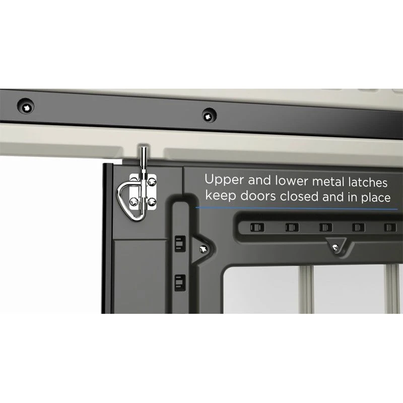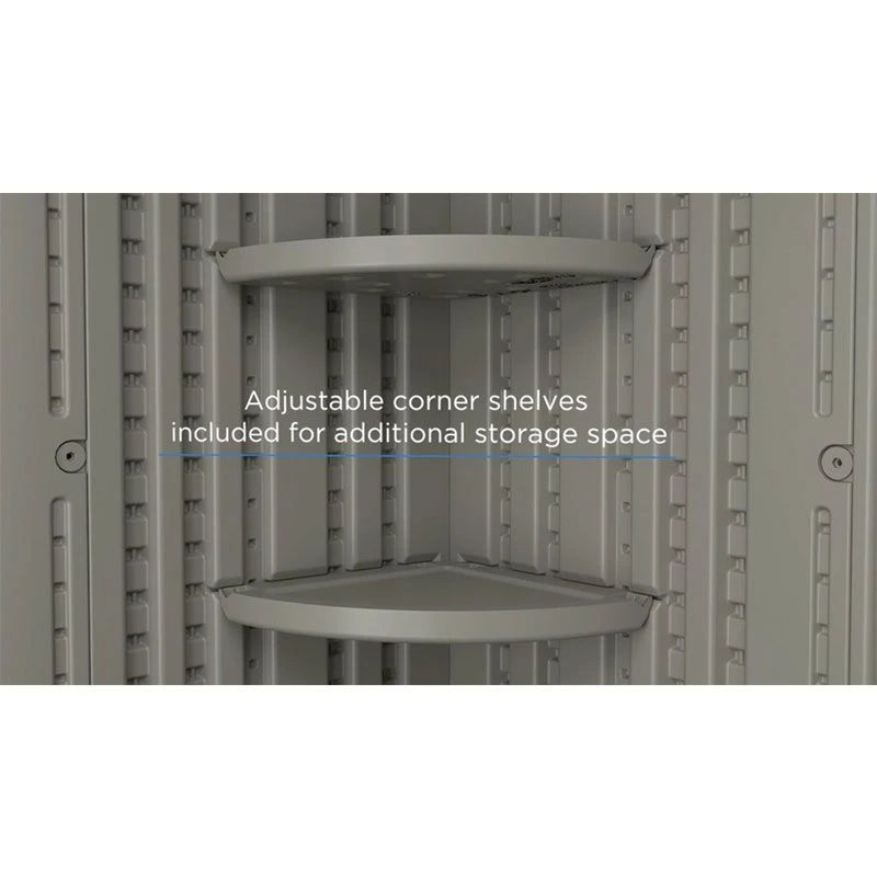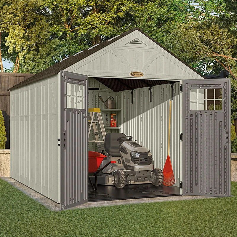 The floor panels are made from extremely reinforced resin which provides support for tractors and other large machinery/tools. This Suncast tremont 8′ x 13′ shed has a huge 714 cubic foot storage capacity meaning this shed is designed to house lots of items and 2 corner shelves which can be placed in 8 locations in the shed, will allow easier storage of smaller tools. The two doors have metal handles which are padlockable (not supplied) which if required will add security to your shed.