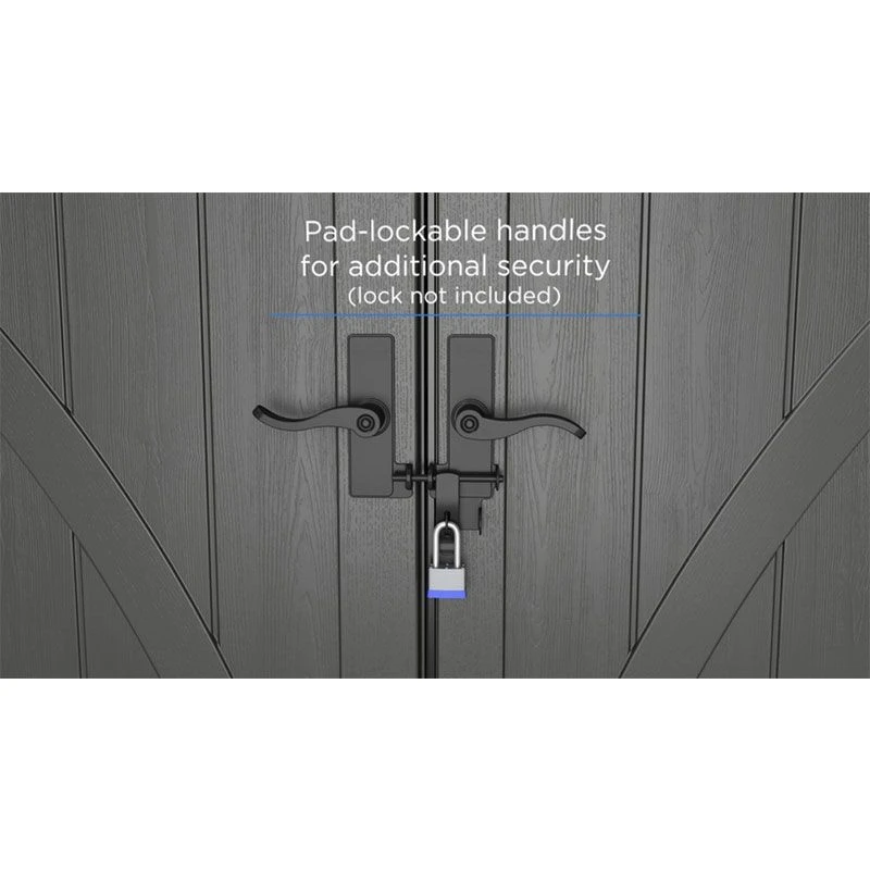 - Double doors to the front of the shed give easy access and have pad-lockable metal handles (lock not supplied) for added security.