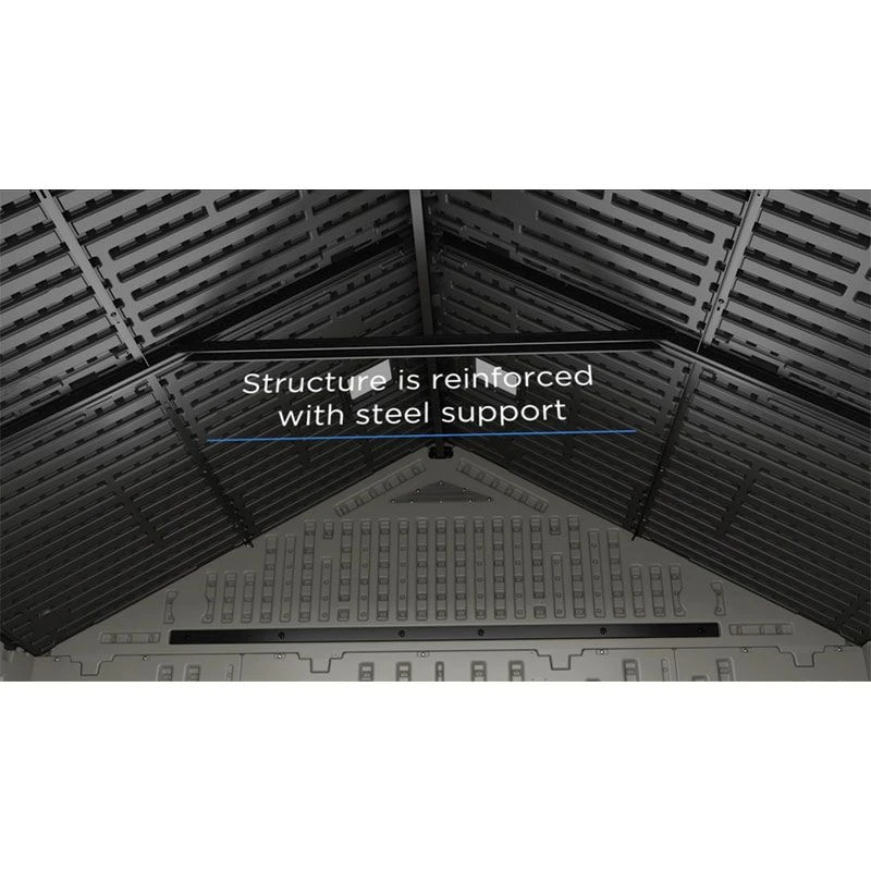 It is constructed from Steel reinforced double wall resin made from an exclusive durable blow moulded technology which composes one of the toughest builds on the market. The metal reinforced shingle style roof panels add to the mighty build and has excellent water run off preventing any water damage to the shed. The roof has six skylights fitted which will allow for a light source.