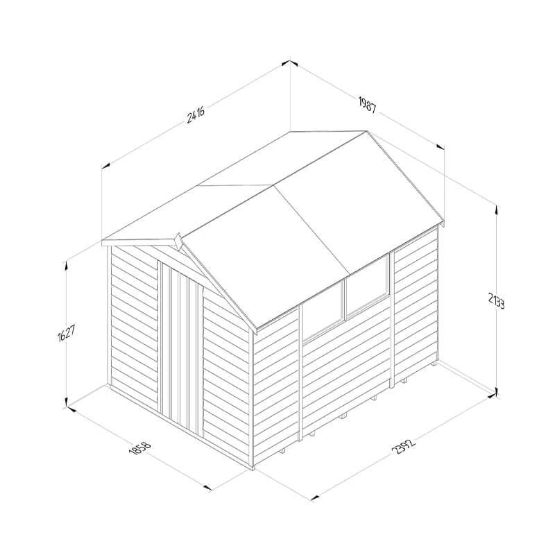 Available in a range of designs and sizes, Forest 4Lifeâ„¢ Overlap Pressure Treated Sheds are beautifully handcrafted here, in Great Britain. Packed full of premium features, they are the best range of overlap sheds Forest has ever made. This particular model is the 8×6 Apex Shed (2.43m x 1.99m), making it perfectly suited to general-purpose storage in most sizes of garden.