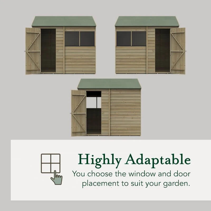 Available in a range of designs and sizes, Forest 4Lifeâ„¢ Overlap Pressure Treated Sheds are beautifully handcrafted here, in Great Britain. Packed full of premium features, they are the best range of overlap sheds Forest has ever made. This particular model is the 8×6 Reverse Apex Shed (2.42m x 1.99m), making it perfectly suited to general-purpose storage in most sizes of garden.