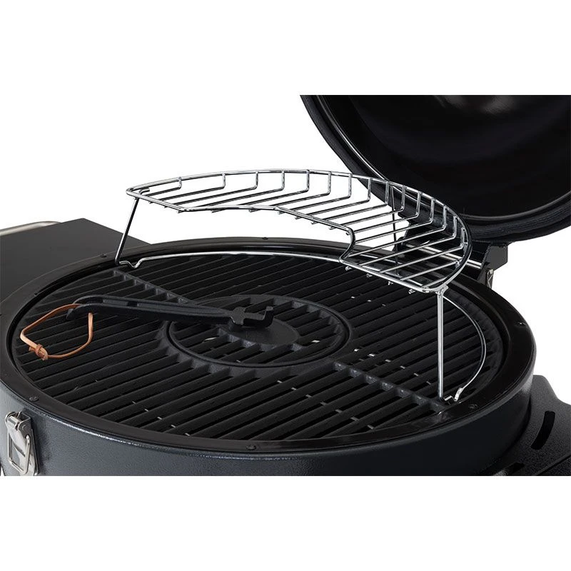 - Temperature gauge, adjustable ventilation chimney, and warming rack