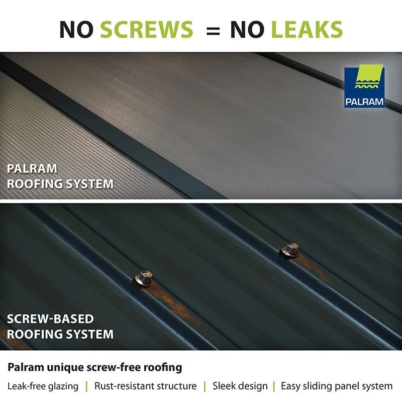 - Slide and lock roof assembly, pre-cut panels, pre-drilled profiles and fixings