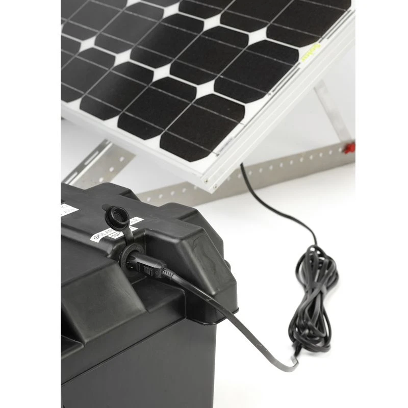 The solar panel must be located outside and is supplied with a robust aluminium stand that allows firm location either on the ground or on a flat roof. The multi position stand ensures the panel is always positioned at the optimum angle – summer and winter. The supplied cable then runs from the solar panel and connects directly into the waterproof battery box, which contains a high performance 85Ah sealed deep cycle solar battery and a charge controller. The battery output cable then needs to enter the building to be connected to the supplied power inverter. The inverter has a UK 3–pin socket where a multi gang extension cable (not supplied) can be attached to run multiple electrical appliances simultaneously. Additionally, a 12v “power out” plug and socket is fitted in the battery box so that 12v appliances can be run directly.